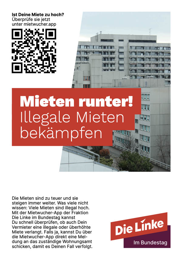 Speziell für die die Städte, für die unsere Mietwucher-App angeboten wird, bieten wir hier ein Flugblatt in A5 zur Bewerbung der App an. Nachstehend verlinkt findet Ihr auch eine Druckdatei für den Selbstdruck (A4, zwei Nutzen).